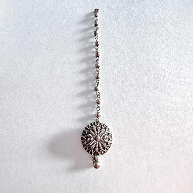 This product can be styled as a Mangtika/Mangteeka or a hair extension. Size- Length(approximately)- 15cms Width(approximately) – 1cms Material- Brass base with German Silver coating. Fastening- Adjustable. Care- Keep in a plastic bag given with the product. Store in a separate box. Keep away from fragrance and water. Note- All our jewellery is handcrafted and therefore variations may occur.