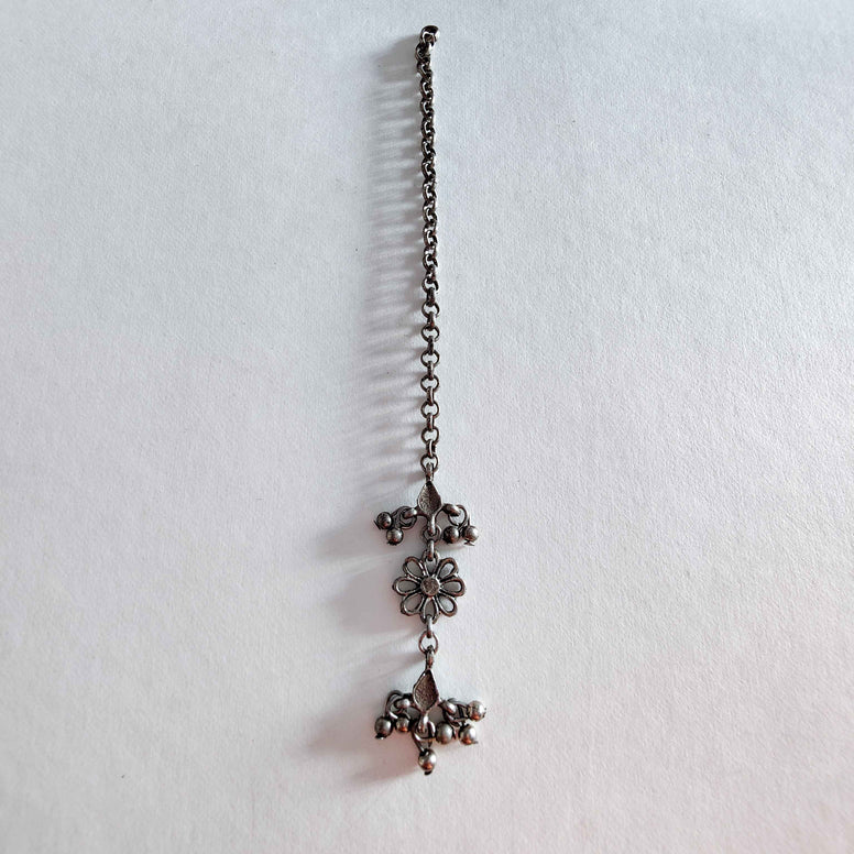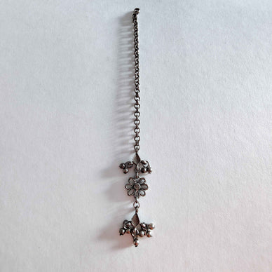 This product can be styled as a Mangtika/Mangteeka or a hair extension. \n \nSize- \nLength(approximately)- 15cms \nWidth(approximately) – 1cms \n \nMaterial- \nBrass base with German Silver coating. \n \nFastening- \nAdjustable. \n \nCare- \nKeep in a plastic bag given with the product. \nStore in a separate box. \nKeep away from fragrance and water. \n \nNote- \nAll our jewellery is handcrafted and therefore variations may occur.